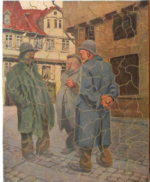 Catalog Code: 1- 1833Description: Excellent color line cutting; title label missing. "The Apple Woman" written on box bottom but doesn't appear to apply. General InformationDate: 1909c.Width: 8"Height: 9" Pieces InformationPieces: 139Figures: 0Styles: push fit Topics: townmenSale Status: Sold