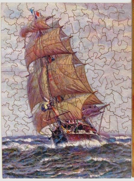 Catalog Code: 2- 20953Description: Premier puzzle (Milton Bradley's best brand) cut by #160. 11 figure pieces, interlocking, some color line cutting. Artist unknown General InformationMaker: Milton Bradley CoSeries: PremierDate: 1930'sWidth: 9"Height: 12"Material: plywoodContainer: box Pieces InformationPieces: 164Colorline: semFigures: 11Interlock: yesStyles: jagged Topics: clipper shipsSale Status: For Sale
