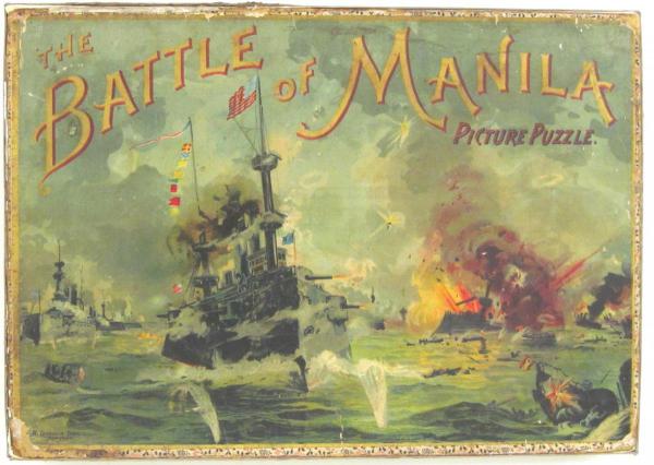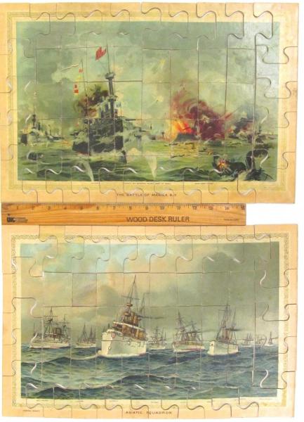 Set of 2 puzzles in same box, each 50 pieces. Press board, edge interlocking but center is not. This set pairs well with "Up the Heights of San Juan" displayed in this section. Popularity of puzzles like this demonstrated the pride Americans felt in the successful(?) outcome of the War of 1898 which catapulted Theodore Roosevelt to the presidency. Artist on at least one of the scenes is F. D. Manor.
