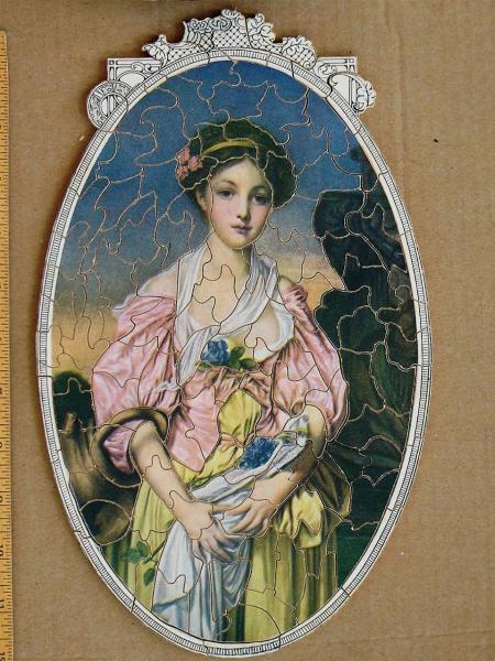 Cut by Frances A. Cooke, Weston, MA 1910's, plywood, non-interlocking, color line cutting. The limits of my tools and skills are shown here. Watercolor pencils simply are not precise enough to draw the detail in the ornate design in replacement piece at top and, to a lesser extent, in replacement piece at bottom. On the other hand two other replacement pieces came out pretty well! Picture appears in multiple puzzles from that era; artist is unknown.