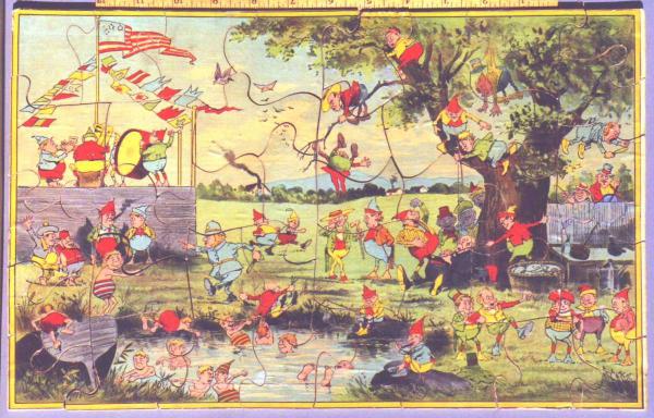 Parker Brothers made several of these humorous (silly?) scenes by Palmer Cox into jigsaw puzzles and McLoughlin made them into block puzzles back in the 1890's. The puzzle pictured here is made of rudimentary plywood and simply cut with some interlocking features. A children's puzzle with appeal to adults? Donated to the American Antiquarian Society.