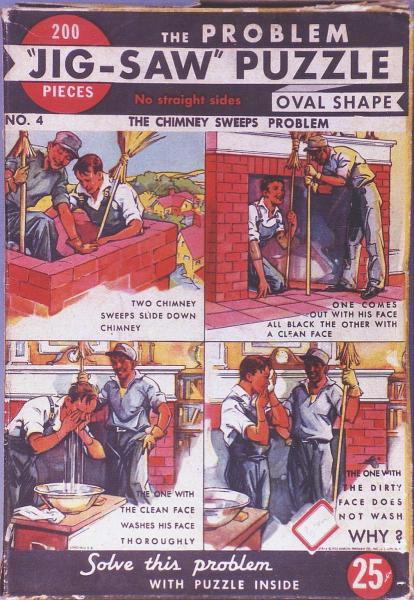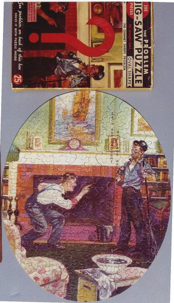 Made 1933 c. by the Einson-Freeman Co., Long Island City, NY as #4 in their Problem Jigsaw Puzzle series, die cut cardboard, oval shaped. Problem (story) is displayed in 4 color panels on back of box; solution is contained in assembled puzzle. Can you solve it?