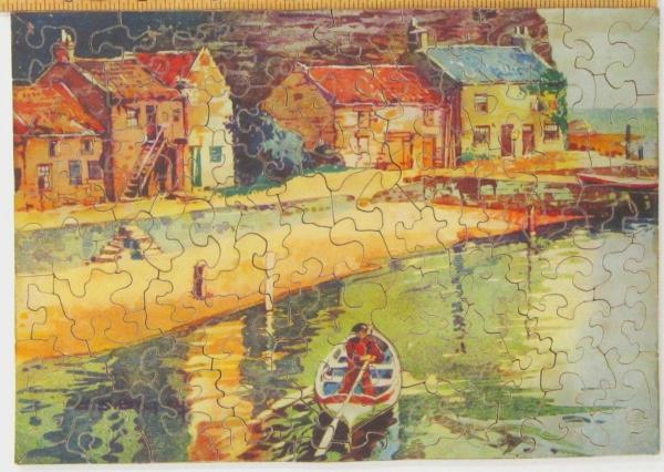 Catalog Code: 2- 21035Description: A Jolly Jigsaw puzzle well cut by Don Simonds, Winchester, MA, one of the better makers in the 1930's, Some color line cutting, good interlock and deceptive edges. Artist unknown. General InformationMaker: Don SimondsSeries: Jolly JigsawsDate: 1930'sWidth: 9"Height: 6"Material: plywoodContainer: box Pieces InformationPieces: 108Colorline: semInterlock: yesStyles: large round knobs Topics: villagecoveSale Status: For Sale