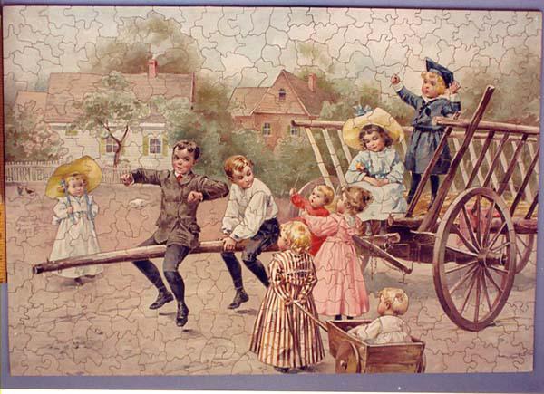 Amateur cutters, unknown to the “outside world”, can cut some of the best and most interesting puzzles. Katinka Treichel, Beaver Dam, WI cut this beauty, probably in the 1920s. Plywood, semi-interlocking, superb color line cutting. Ms. Treichel’s selection of artwork and cutting were the equal of any professional of her day.
