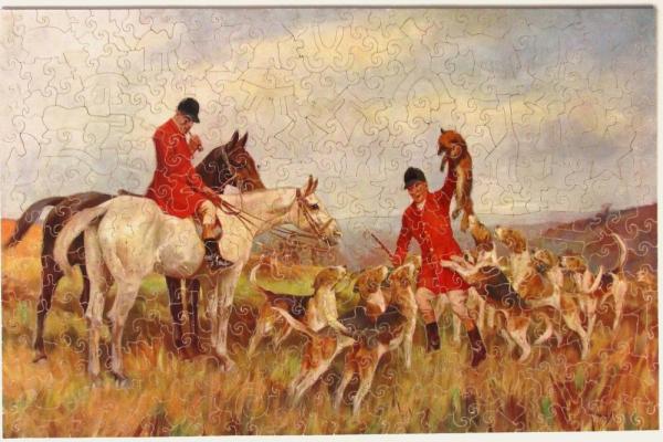 Catalog Code: 2- 20847Description: 39 figurals; excellent example of curl cutting of knobs; scene is "politically incorrect"!General InformationDate: 1930sWidth: 19"Height: 13"Material: plywoodContainer: box Pieces InformationPieces: 460Colorline: yesFigures: 39Interlock: yesStyles: curl knobs Topics: foxSale Status: Sold