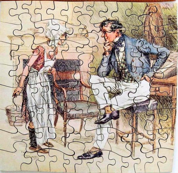 Scene from Dickens' The Old Curiosity Shop, Puzzle No 14 in 2nd series.  Dick Swiveller becomes interested in improving the Brass family's ill-treated maidservant and does such a good job that he eventually marries her.  Artist is Frank Reynolds.  No repairs needed.