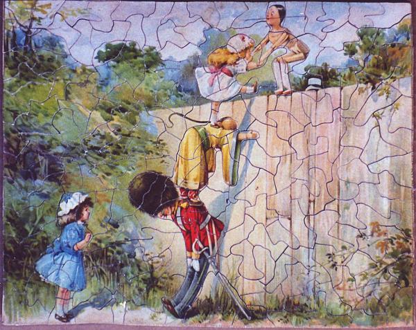 Catalog Code: 1- 1241Description: Unknown maker, cut 1909 c, solid wood, non-interlocking, along color lines. Artist: unknown. Most unusual scene of toys helping children escape over wall from garden. General InformationDate: 1909c.Width: 10"Height: 8"Material: solidwoodContainer: replaced Pieces InformationPieces: 209Colorline: yesInterlock: noStyles: push fit Topics: childrentoysSale Status: Not for SaleCollection: 1900 to 1930 Hand Cut Puzzles
