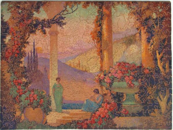 Catalog Code: 2- 20720Description: 11 figurals. Tight cutGeneral InformationDate: 1938c.Width: 16"Height: 12"Material: plywoodContainer: replaced Pieces InformationPieces: 400Pieces Replaced: 2Colorline: noFigures: 11Interlock: yesStyles: round knobs1-by-1 Topics: idyllicgardensSale Status: Sold