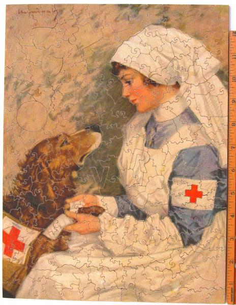 Scene appealed to me, probably because I grew up with a dog for 15 years. Even today, when out walking and encountering a neighbor walking their dog, I always stop and "talk" to the dog (not so much the neighbor!) Pastime puzzle cut by #96, Parker Brothers, Salem, MA in 1929. Plywood, interlocking, cut along color lines with 24 figure pieces. Artist unknown,but picture was used for a WW I poster and appeared in the Ladies Home Journal. Dog is a Golden Retriever (we think).