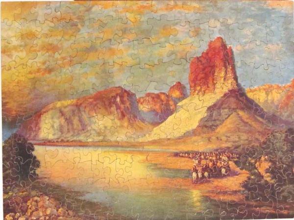 Unknown maker.  Colors employed by probable artist, Thomas Moran, are spectacular.  The Green River Formation is an Eocene geologic formation that records the sedimentation in a group of intermountain lakes in three basins along the present-day Green River in Colorado, Wyoming, and Utah.  Wikipedia.  The scene also captures a large band of Native Americans riding along the lake in the foreground.  Puzzle is cut tightly and must be disassembled carefully, preferably in dry weather.