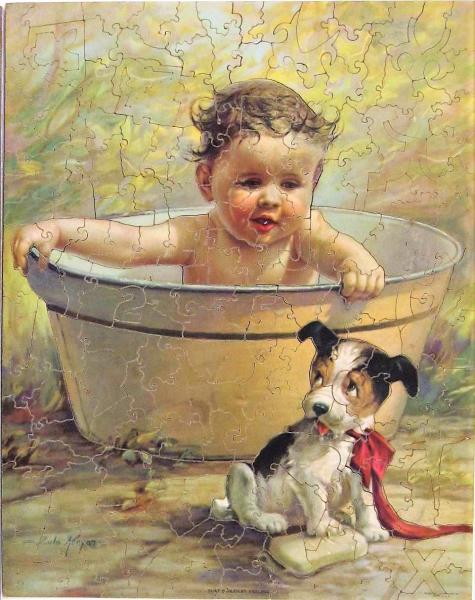 Sawed by Pastime cutter #93R; interlocking with color line cutting and 24 figure pieces. Why is our cute little dog feeling so guilty? Has he peed on the bar of soap? A humorous scene by artist Zula Kenyon. Zula Kenyon (1873-1947) was an illustrator and studied under Frederick Freer at the Art Institute in Chicago. Although she completed some early work for various companies, she began doing artwork for the Gerlach Barklow Calendar Company of Joliet, Il shortly after it was founded in 1907. However, in those days calendar company customers were reluctant to purchase images created by a women, and the company asked her to only sign her early work "Kenyon". But she soon signed an exclusive contract with Gerlach Barklow Calendar company due to her work being so successful for its calendar images and sales. Wikipedia. A small victory for women!