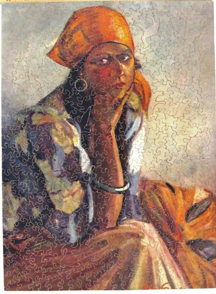 Well cut puzzle by C.L. Schreiner, Pasadena, CA 1940's. Plywood, interlocking, 7 figure pieces. While artist's name is cut off, Google search has identified him as Roy Grossman, active in Los Angeles area in the 1920's and picture dated 1925. Title a/k/a "The Pirate Queen" but "The Gypsy" is the artist's title.