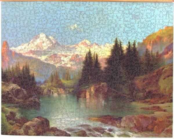 Huge U-Nit puzzle cut by James Browning, W. Caldwell, NJ 1940/50's.  Very few puzzle this large and obviously, very challenging!  Plywood, interlocking, cut with 127 figure pieces. Artist is Thomas Moran a well known American landscape painter.