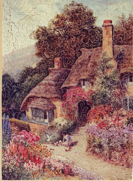 One of the 2 dozen original Armstrong family puzzles I inherited. Puzzling Puzzles series cut by Elihu Tuttle, Providence, RI. Plywood, interlocking, cut along color lines with 22 figure pieces. Artist is Claude Strachan. Same scene but different maker is displayed at "In the Hills of Devon".