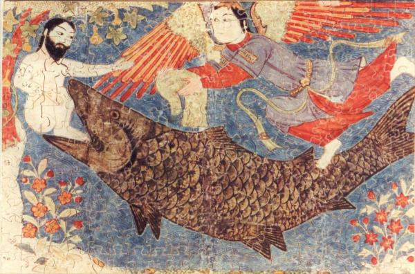 We commissioned Charles Russell, Auburn, MA in 1974 to cut this small copy of illustrations dating back to 1400 AD.  The story of Jonah and the Whale, mentioned in the Qur'an (37:139), was popular in the Muslim world and frequently illustrated in manuscripts of world history. The large-scale painting in the Metropolitan Museum of Art, NYC, however, never formed part of a manuscript. Rather, it may have been used during oral recitation or storytelling. Scholars have also suggested that with its strong palette, monumental figures, and spare composition, this work may reflect a now-lost wall painting tradition. Here, we see Jonah after his release from the belly of the fish. Above him, a gourd vine grows—sent by God to protect him from the elements—and, gliding across the top of the painting, a spirited angel with colorful spreading wings offers Jonah a garment.  Wikipedia