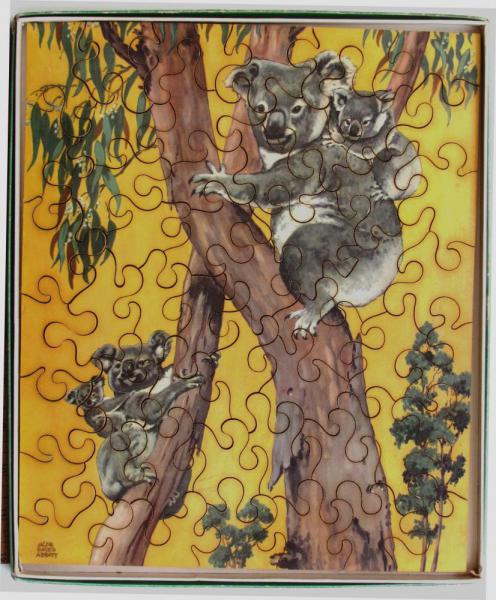 Catalog Code: 9- 9036Description: Large pieces; cute sceneGeneral InformationDate: 1950sWidth: 10"Height: 12"Material: plywoodContainer: box Pieces InformationPieces: 50Colorline: noInterlock: yesStyles: large curve knob Topics: animalsSale Status: Sold