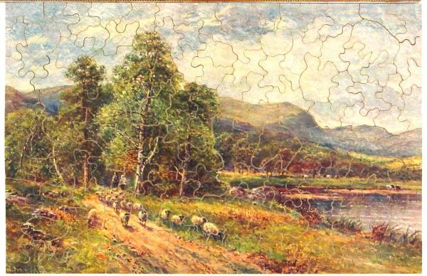 Pastime puzzle cut with 12 figure pieces, semi-interlocking, partially cut along color lines.  No repairs needed.  Artist is Carl Brennir, a British landscape painter.