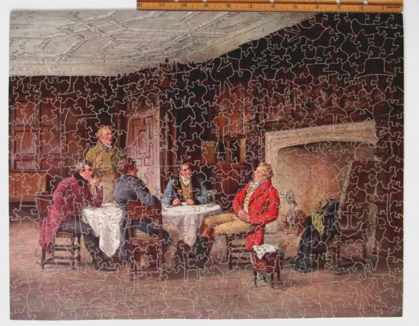 Catalog Code: 2- 20556Description: Classic English scene and quality puzzle. General InformationDate: 1930sWidth: 18"Height: 14" Pieces InformationPieces: 510Pieces Replaced: 1Figures: 50Styles: earlet knobs Topics: menSale Status: Sold