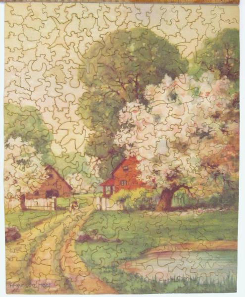 Catalog Code: 2- 20931Description: More figure pieces than in comparable sized Pastimes. Pale colors; mahogany backing General InformationMaker: James BrowningSeries: U-NitDate: 1940/50Width: 13"Height: 16"Material: plywoodContainer: box Pieces InformationPieces: 310Colorline: noFigures: 43Interlock: yesStyles: earlet knobs Topics: countrysideSale Status: For Sale