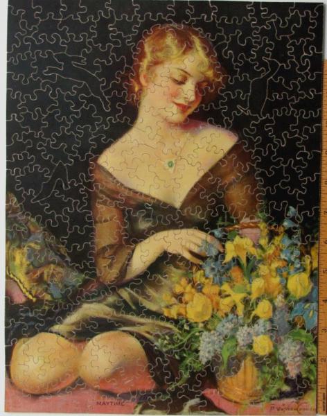 Catalog Code: 2- 20774Description: Top condition; good interlock. General InformationDate: 1930sWidth: 11"Height: 14" Pieces InformationPieces: 252Figures: 3Styles: 1-by-1round knobssem clc Topics: flowerswomenSale Status: Sold