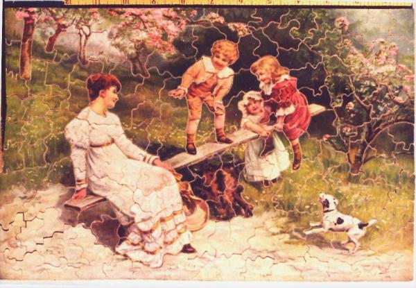 Very appealing scene by artist Fred Morgan. Puzzle cut by Katinka Treichel, Beaver Dam, WI 1910's. She was one of the best unknown cutters I have found.  Plywood, semi-interlocking, cut along color lines. Simply a terrific puzzle!  Frederick Morgan ROI was an English painter of portraits, animals, domestic and country scenes. He became known for his idyllic genre scenes of childhood. Wikipedia