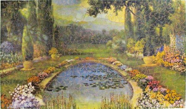 Pastime puzzle cut along color lines in 1930's with 86 figure pieces in a foot knob style. Artist is the well known R. Atkinson Fox who was a popular and prolific commercial artist from the early 1900s until the early 1930s. He was commissioned by major calendar companies and art print publishers to illustrate calendars, posters, postcards, picture puzzles, and various advertising materials. From the website of the R. Atkinson Fox Society. Puzzle was reboxed for Burner's Lending Library, Montclair, NJ but clearly is a Pastime puzzle.