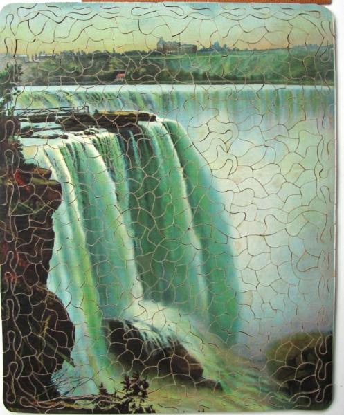 Catalog Code: 2- 20810Description: Old view of Falls; thick wood; nice colorsGeneral InformationDate: 1930sWidth: 16"Height: 20"Material: plywoodContainer: box Pieces InformationPieces: 474Pieces Replaced: 1Colorline: noInterlock: edgeStyles: push fit centerlong round knobs (edge) Topics: waterfallsSale Status: Sold