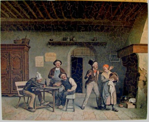 Catalog Code: 1- 1653Description: A period piece by artist, Jean Moreau, late 18th century painter. 3 geometric figures, color line cutting. General InformationArtist: Jean MoreauDate: 1910'sWidth: 19"Height: 16"Material: plywoodContainer: box Pieces InformationPieces: 405Pieces Replaced: 3Colorline: yesFigures: 3Interlock: noStyles: push fit Topics: tavernhumorpeopleSale Status: For Sale