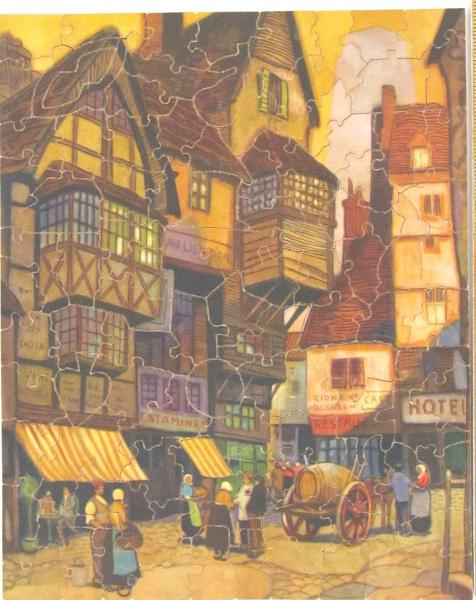 Catalog Code: P- 1126Description: Cutter #754; 12 figure pieces; very nice Tudor town scene. Unusual figure piece in upper left (see above). General InformationMaker: Parker BrothersSeries: PastimeDate: 1930'sWidth: 8"Height: 10"Material: plywoodContainer: box Pieces InformationPieces: 103Colorline: semFigures: 12Interlock: yesStyles: round knobs Topics: tudortownSale Status: For Sale