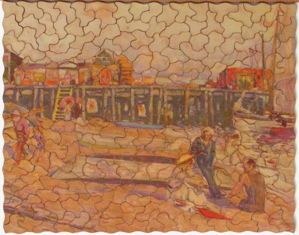 Catalog Code: 1- 1790Description: Very early puzzle; scalloped edges (unusual); aged.General InformationDate: 1909c.Width: 11"Height: 9"Material: solidwoodContainer: box Pieces InformationPieces: 255Pieces Replaced: 2Colorline: semInterlock: noStyles: push fitsem clc Topics: harborpeopleSale Status: Sold