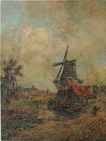 Catalog Code: 2- 20581Description: Well cut puzzle.General InformationDate: 1930sWidth: 9"Height: 12"Material: plywoodContainer: box Pieces InformationPieces: 187Pieces Replaced: 2Colorline: yesFigures: 13Interlock: yesStyles: long/rd Topics: windmillSale Status: Sold