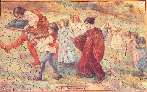 Catalog Code: 1- 135Description: Wonderful soft scene of well known tale. Unknown maker, solid wood, non-interlocking, cut along color lines. Artist is unknown but copyright date is 1908. General InformationDate: 1909c.Width: 16"Height: 10"Material: solidwoodContainer: box Pieces InformationPieces: 323Pieces Replaced: 6Colorline: yesInterlock: noStyles: push fit Topics: fairy talePied PiperSale Status: Not for SaleCollection: 1900 to 1930 Hand Cut Puzzles