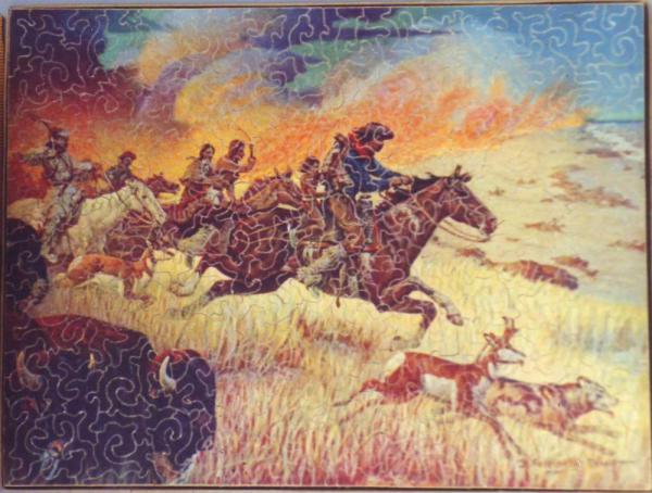 Catalog Code: 2- 02527Description: Action scene. Well cut with a scroll style of cutting and edge pieces interlocking from inside, not from each other. General InformationDate: 1930sWidth: 12"Height: 9" Pieces InformationPieces: 250Figures: 0Styles: scroll Topics: Native AmericansWesternSale Status: Sold