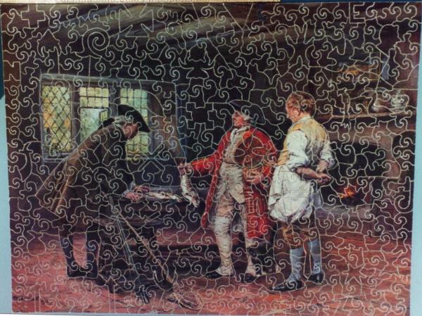 Boxed in a wood box with a sliding lid and sold through Macy's, but we don't know who did the cutting.  Some of their puzzles were cut by Pastime cutters.  Interlocking, cut along color lines with 43 figure pieces.  Picture displays aesthetically pleasing curl knob cutting style well because of dark background.  Artist is Frank M. Bennett (1874–1952), a British painter of portraits, historical scenes and architecture. He was known for his posthumous portraits, particularly of soldiers killed during the First World War, which were commissioned by grieving relatives as a remembrance of their sons and husbands.  Art date is 1929.