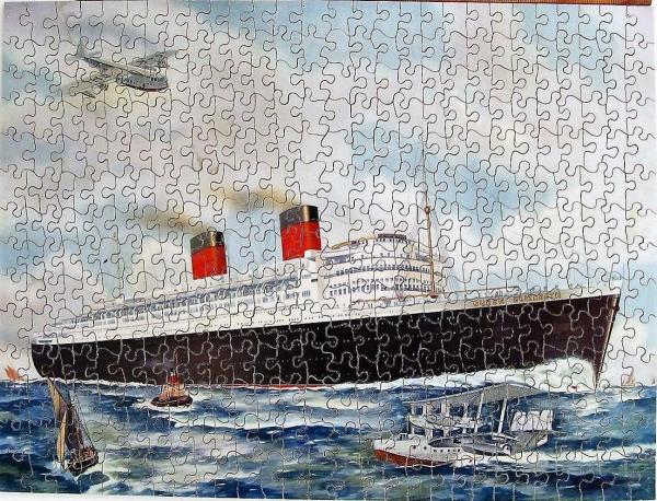Catalog Code: 2- 21097Description: Colorful picture of famous ocean liner. Made by G.J. Hayter & Co., Bournemouth, England 1930/40's. Mfg.#: T.P.6. Artist unknown. No repairs needed. General InformationMaker: Hayter & CoSeries: Victory TopicalDate: 1930/40'sWidth: 17"Height: 13"Material: plywoodContainer: box Pieces InformationPieces: 400Colorline: noInterlock: yesStyles: round knobs Topics: ocean linerSale Status: For Sale