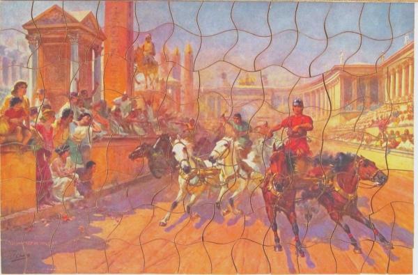Catalog Code: 1- 1693Description: Colorful action scene of a Roman chariot race. No repairs needed; excellent condition. Unknown maker and artist. Simply cut on plywood. General InformationDate: 1910'sWidth: 11"Height: 7"Material: cardboardContainer: box Pieces InformationPieces: 106Colorline: noInterlock: noStyles: push fit Topics: RomanracingchariotsSale Status: For Sale