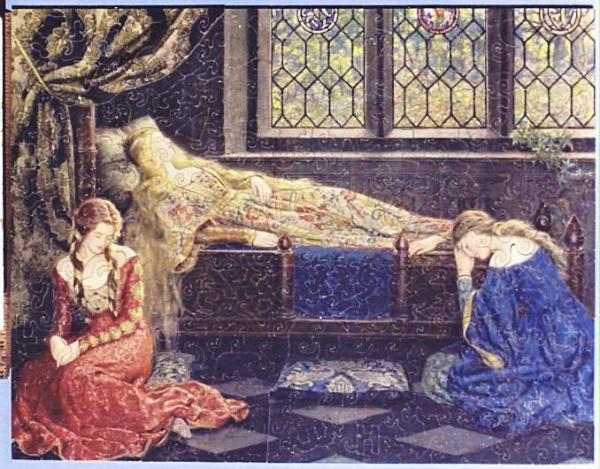 Cut in 1937 by Pastime cutter #38, plywood, interlocking, color line cut, 51 figure pieces. Appealing scene first issued as a Pears Soap print in 1921. Unfortunately, #38 must have had a bad day because her blade was slanted during the cutting process resulting in the pieces only going together from one direction. I have corrected this defect by using a Dremel grinder to grind off from the back the slant on each piece interfering with assembling the puzzle. This does not affect the front of the puzzle, but does widen the cut lines on the back and is highly "labor intensive" and boring. Professional cutters rarely make such a mistake. Thank goodness! Artist is John Collier (1812-1876). The Honourable John Maler Collier OBE ROI RP was a British painter and writer. He painted in the Pre-Raphaelite style, and was one of the most prominent portrait painters of his generation. Both of his marriages were to daughters of Thomas Henry Huxley. Wikipedia.