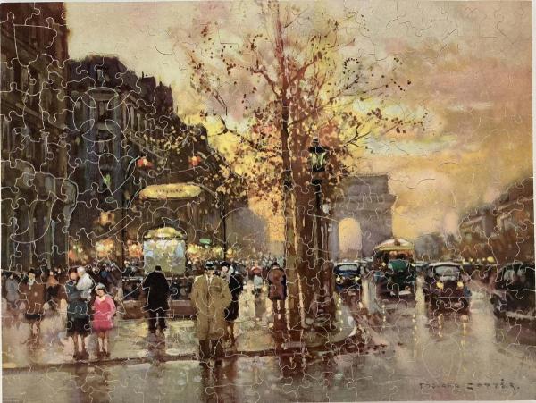 Parker Brothers Pastime puzzle cut by #754 in 1940's. Interlocking, cut along color lines with 34 figure pieces. Artist signature difficult to read but I think it is Edouard Cortes (1882-1969), a French painter, known for his Paris cityscapes in a variety of weather and night settings.