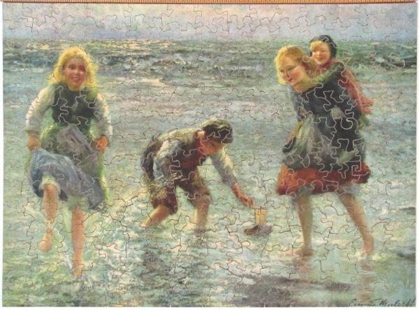 Catalog Code: 2- 20923Description: Top condition; well cut puzzle. General InformationDate: 1933c.Width: 12"Height: 9" Pieces InformationPieces: 200Figures: 0Styles: square knobs Topics: childrenbeachSale Status: Sold