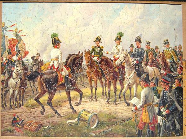 A spectacular Pastime puzzle made by Parker Brothers, Salem, MA, 1910's. Plywood, semi-interlocking, cut along color lines with 74 figure pieces. Artist is W.A. Roehling. The battle took place in October 1913 and involved the coalition armies of Russia, Prussia, Austria and Sweden against the French army of Napoleon (with some Polish, Italian and German forces). Napoleon was decisively defeated and had to return to France and eventually abdicated in 1814 and was exiled to Elba. Presumably, the 3 emperors depicted are the Russian, Prussian and Austrian emperors.