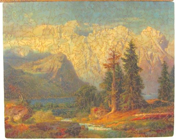Early U-Unit puzzle cut by James Browning when he was living in East Orange, NJ in the 1930's. Plywood, interlocking, 75 figure pieces of which 10 are 2 piece figures. More figure pieces than comparable Pastime puzzle. Mahogany backing. Is mountain range pictured the Grand Tetons?