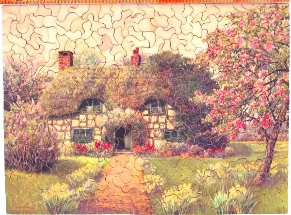 Catalog Code: 1- 1285Description: Thin wood; difficult; includes names of assemblers. Some discolor in sky (not noticed during our assembly) so price reduced. General InformationArtist: MathewsDate: 1909c.Width: 12"Height: 9"Material: plywoodContainer: box Pieces InformationPieces: 386Pieces Replaced: 2Colorline: noInterlock: noStyles: push fit Topics: thatched cottageSale Status: For Sale