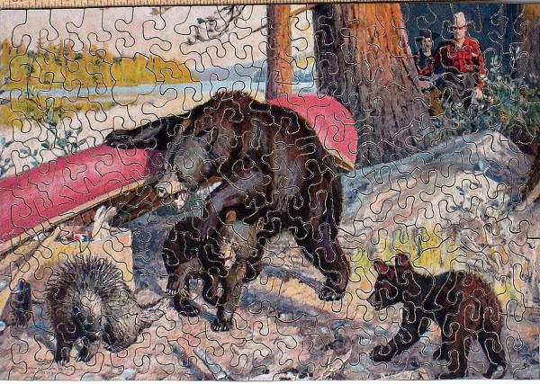 This Mama Bear is confronting two dangers while caring for her cubs and searching for food: a porcupine and the two men whose food she is about to raid. The men do not appear to have rifles and may back off, but the porcupine may seriously injure Mama Bear if she doesn't also back off. Kleen Kut puzzle made by John Knoll, Reading, PA 1930's, plywood, interlocking, 9 figure pieces, well cut. Artist is Philip R. Goodwin (1930).