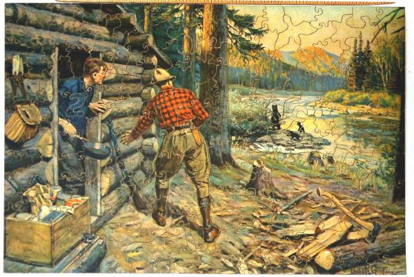 There is enough time and distance for a few warning shots to scare Mama Bear away with her cubs. Otherwise, she will probably lose this encounter. Pastime puzzle made by Parker Brothers, Salem, MA 1920's. Plywood, interlocking, cut along color lines with 24 figure pieces. Artist is Philip R. Goodwin.  Picture also known as "Bear in Mind".