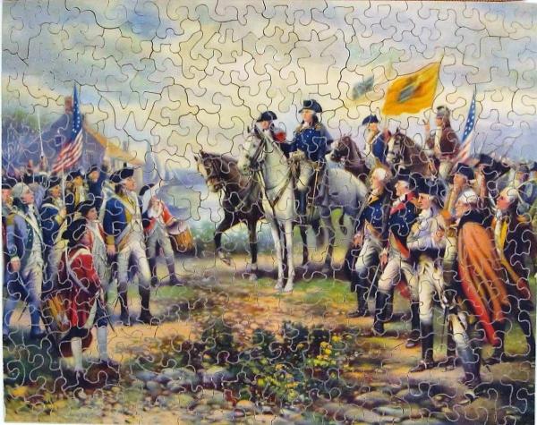 Catalog Code: 2- 21124Description: Colorful scene, interlocking, 4 figure pieces, tight fit. Artist and puzzle maker both unknown and Google no help. General InformationDate: 1930'sWidth: 12"Height: 10"Material: plywoodContainer: replaced Pieces InformationPieces: 280Colorline: noFigures: 4Interlock: yesStyles: curve knobs Topics: WashingtonRevolutionary WarSale Status: For Sale