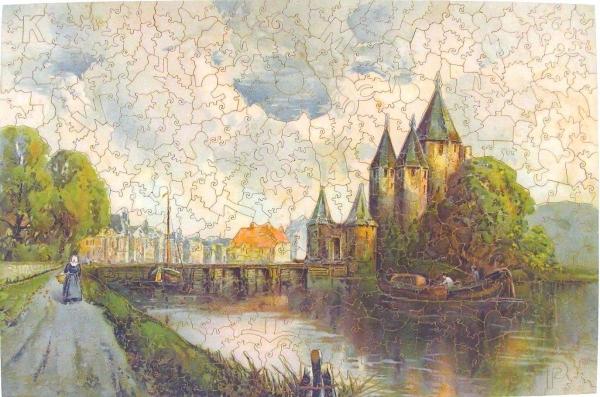 Catalog Code: P- 1241Description: Pastime puzzle cut by #112. Interlocking, cut along color lines with 60 figure pieces, some very intricate. Original box missing but original labels intact. Unknown artist. General InformationMaker: Parker BrothersSeries: PastimeDate: 1931Width: 22"Height: 14"Material: plywoodContainer: replaced Pieces InformationPieces: 508Colorline: yesFigures: 60Interlock: yesStyles: curl knobs Topics: EuropeanchateautownSale Status: For Sale