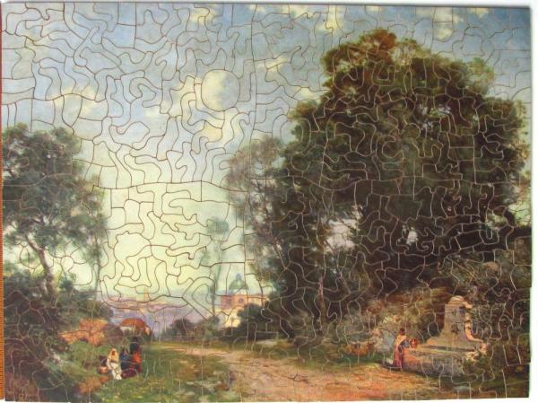 Catalog Code: 1- 1787Description: Simple figurals; smaller pieces; challenging; art date: 1907General InformationDate: 1910/20sWidth: 16"Height: 12"Material: plywoodContainer: replaced Pieces InformationPieces: 493Pieces Replaced: 3Colorline: noFigures: 22Interlock: semStyles: sem-lklong p-f Topics: countrysideSale Status: Sold