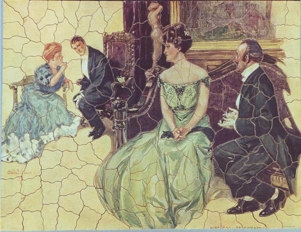 Wonderful humorous scene of older woman (mother?) acting as matchmaker when younger couple simply wants to be left alone. A Mosaic Picture Puzzle made 1909 c, plywood, non-interlocking, cut along color lines. Artist: unknown