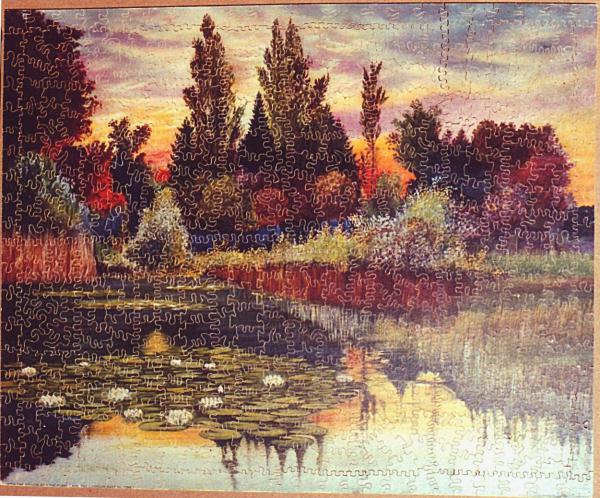 Extraordinarily colorful scene by unknown artist cut into a lovely puzzle by Chester Nott, Canandaigua, NY in 1930's. Plywood, 1-by-1 rd kb interlocking style, but no color line cutting or figure pieces.