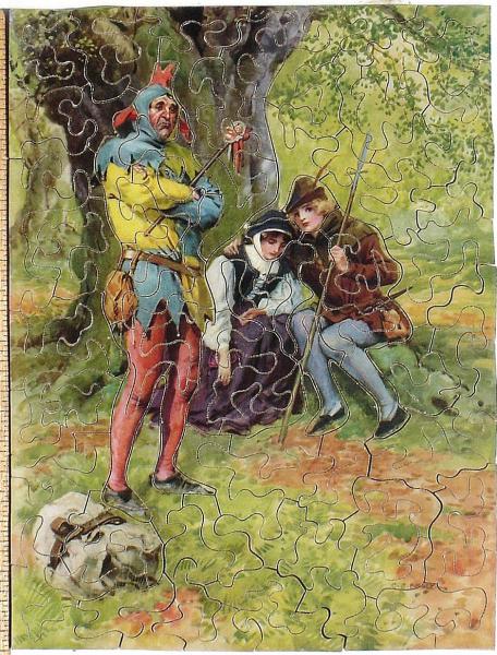 Jolly Jigsaws puzzle cut by Don Simonds, Winchester, MA, 1930's; plywood; interlocking; color line cut. Very colorful and well done depiction by unknown artist of Act II, Scene 4 when Rosalind (disguised as a young page named Ganymede), Celia (disguised as a country girl named Aliena), and Touchstone the Clown enter the Forest of Arden. They are exhausted from traveling and stop to rest.